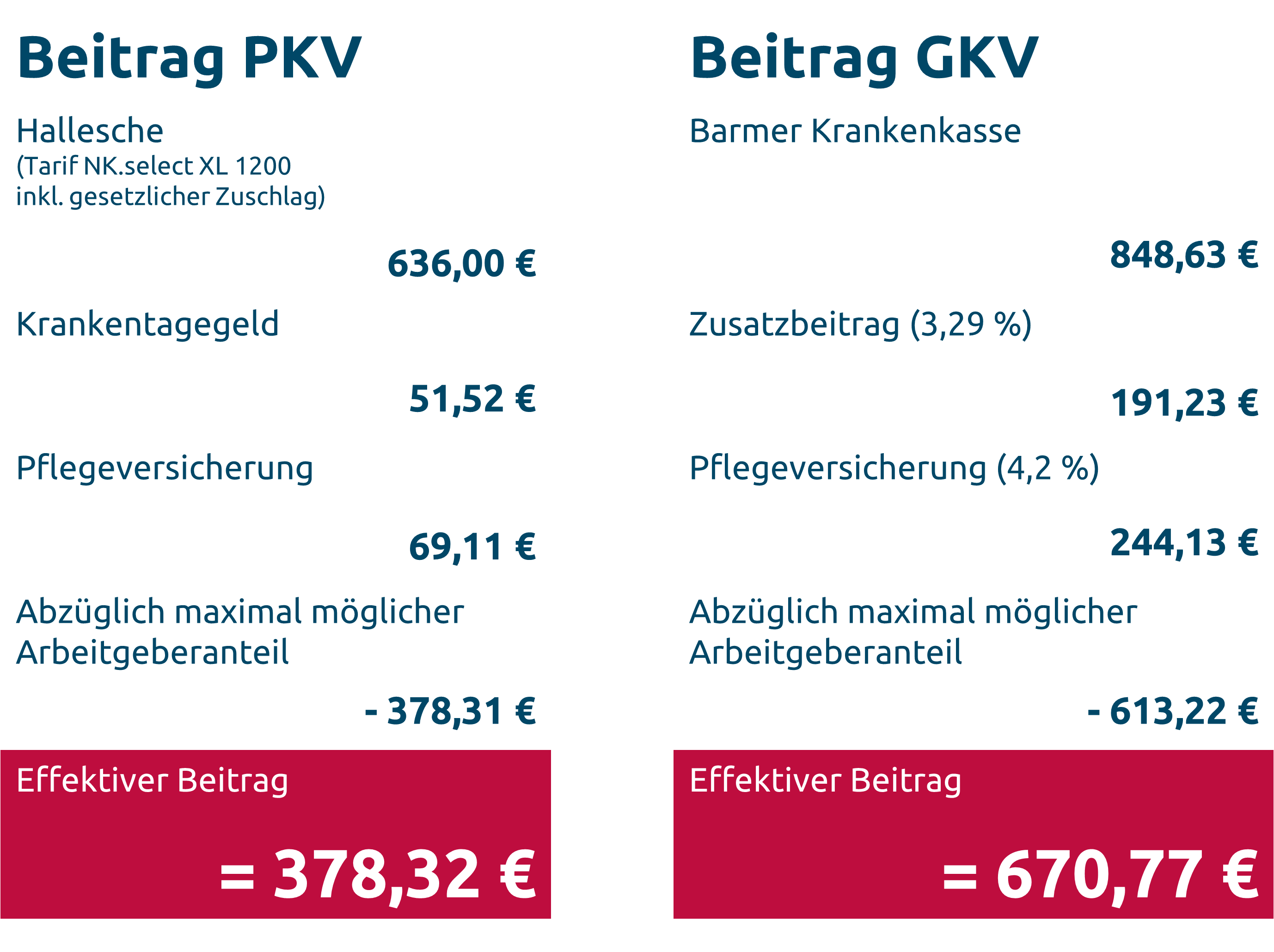 Das folgende Rechenbeispiel zeigt den Vergleich zwischen einem PKV-Beitrag und GKV-Beitrag, bei einem Einkommen an der Beitragsbemessungsgrenze.