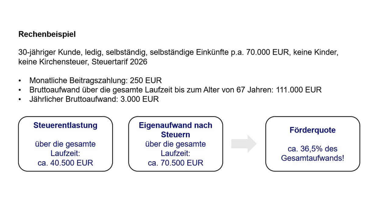 Alle Angaben dienen ausschließlich Illustrationszwecken und können nicht garantiert werden. Diese Berechnung ersetzt keine individuelle Beratung. Eine verbindliche Beratung zu steuerlichen Auswirkungen eines Versicherungsvertragsabschlusses kann nur durch einen Steuerberater erfolgen.